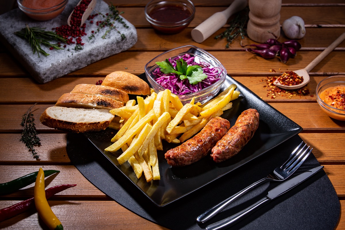 Cârnăciori groși de porc (2 buc), cartofi pai naturali (150 g), chiflă (80 g), salată (130 g) sau sos la alegere (50 g)