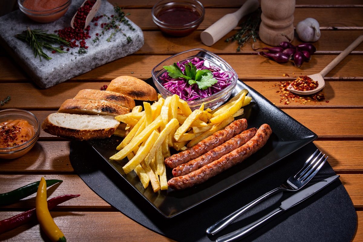 Ingrediente: cârnăciori subțiri de porc (4 buc), cartofi pai naturali (150 g), chiflă (80 g), salată (130 g) sau sos la alegere (50 g)