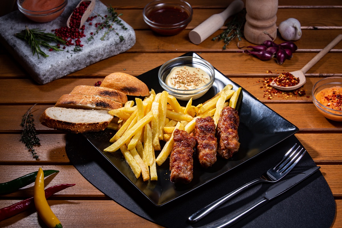 Ingrediente: mici (3 buc), cartofi pai naturali (150 g), chiflă (80 g), muștar (50 g)